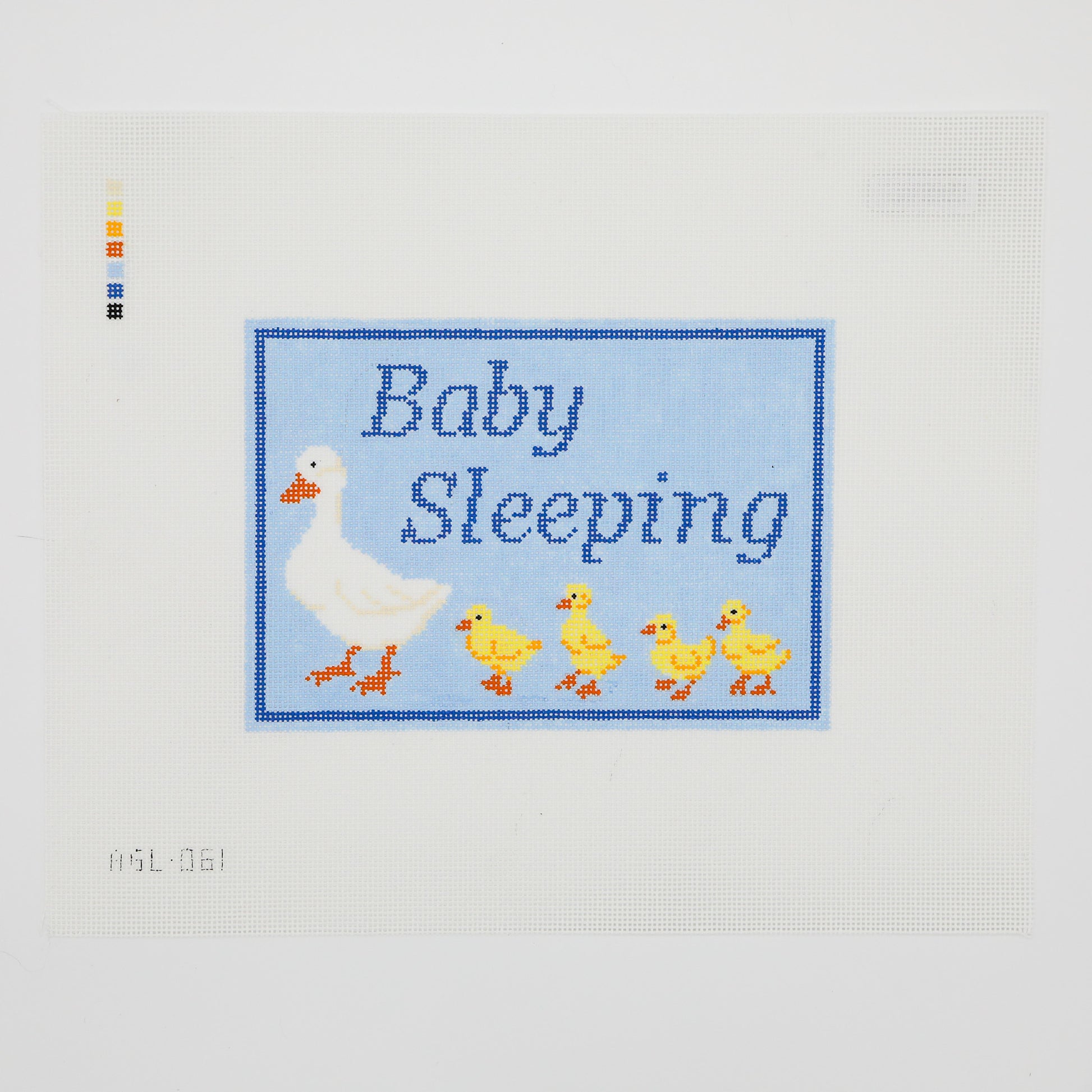 Sweet and full of charm, the Baby Sleeping needlepoint canvas in blue features a gentle "Baby Sleeping" message with an adorable row of little ducklings marching below. Hand-painted on 18 mesh canvas and measuring 6.5" x 4.5", this design is perfect for adding a playful yet classic touch to any nursery.
